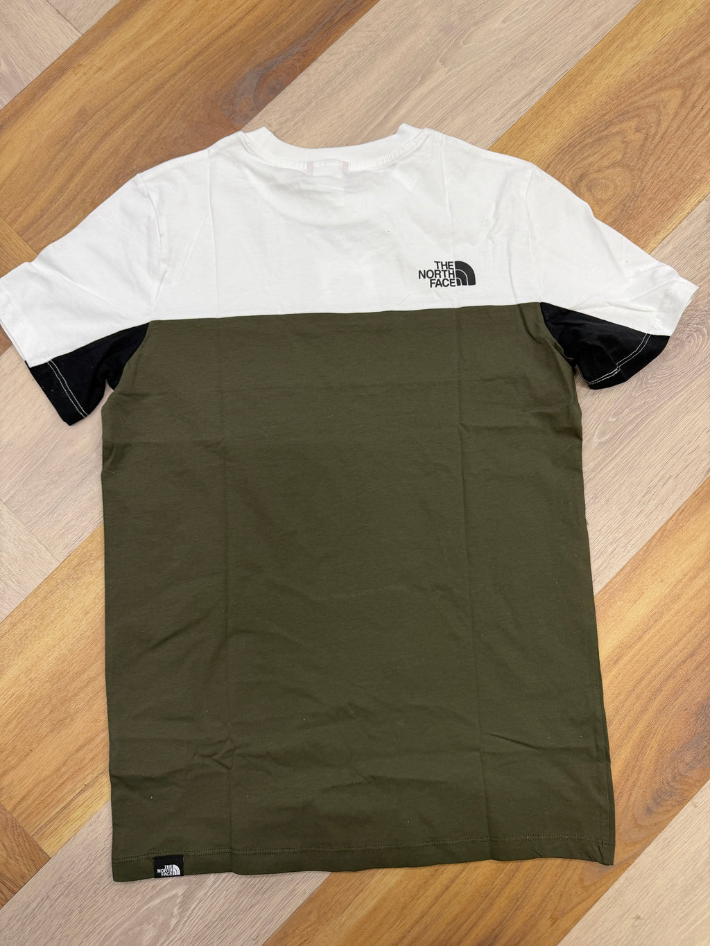 JNF presents a boys’ color-block North Face T-shirt designed with a crisp white upper, bold black chest band, and deep olive green lower panel for a clean, modern look. Crafted from soft, breathable cotton, it features front and back logo prints and contrast sleeve detailing—perfect for everyday wear, school, or outdoor adventures